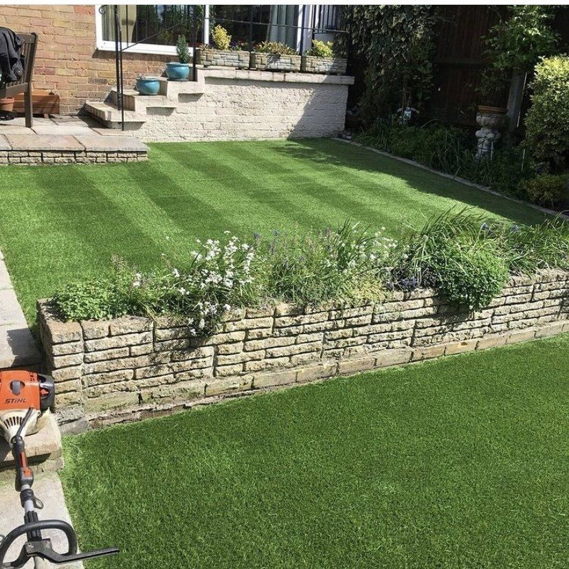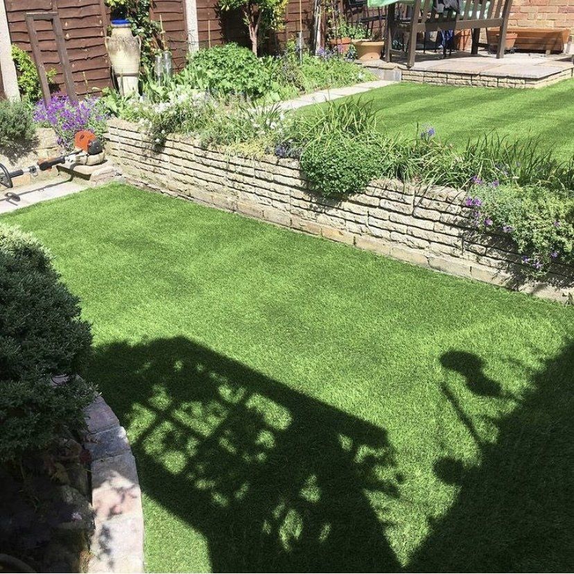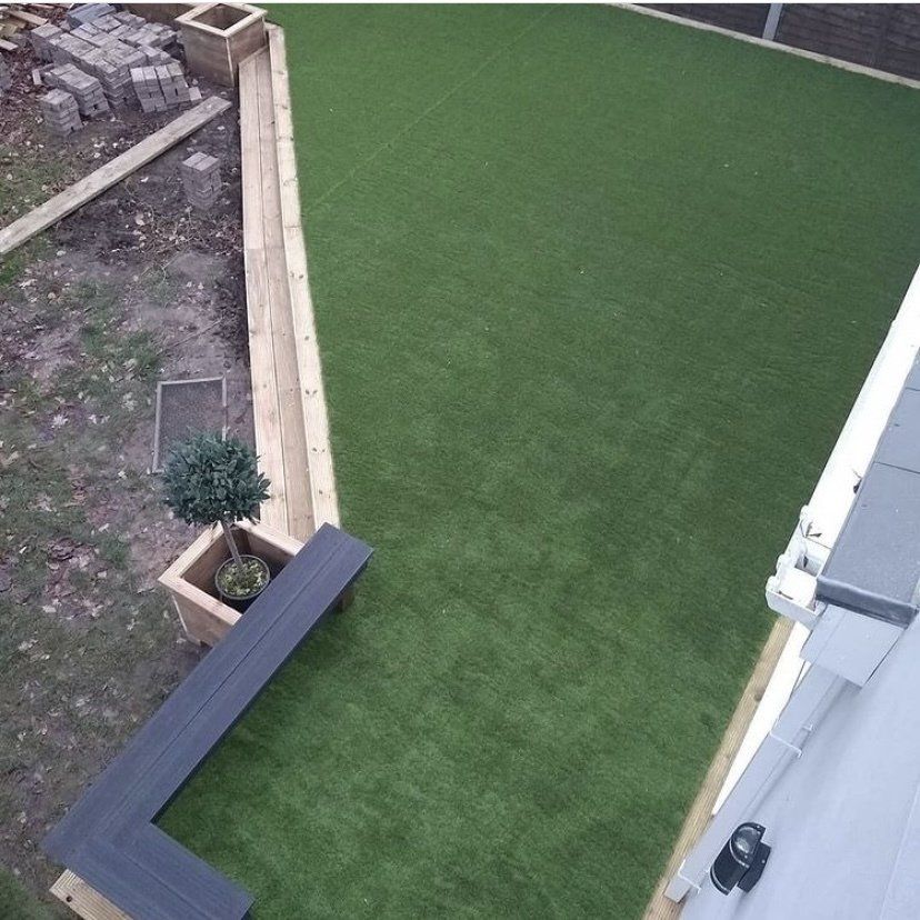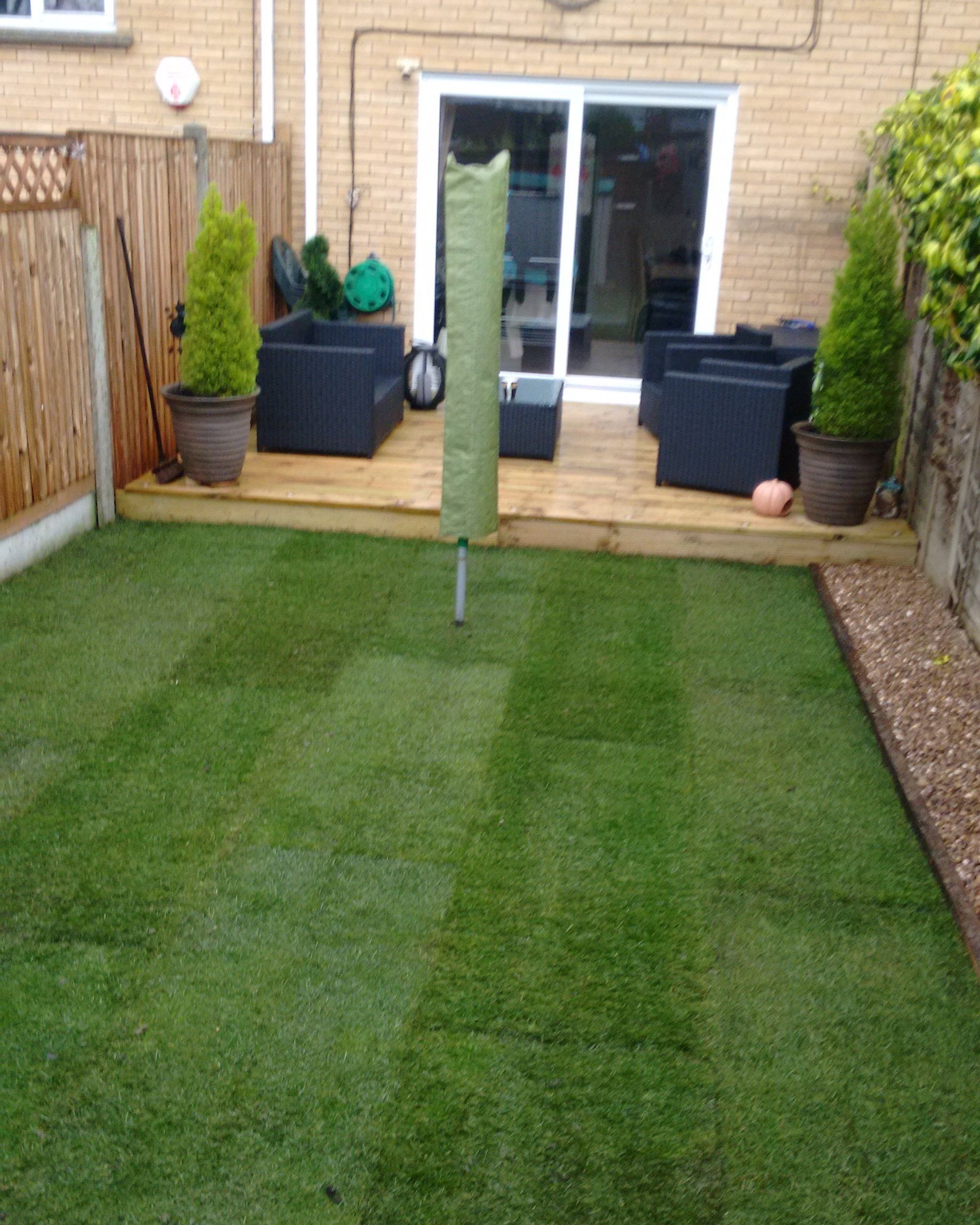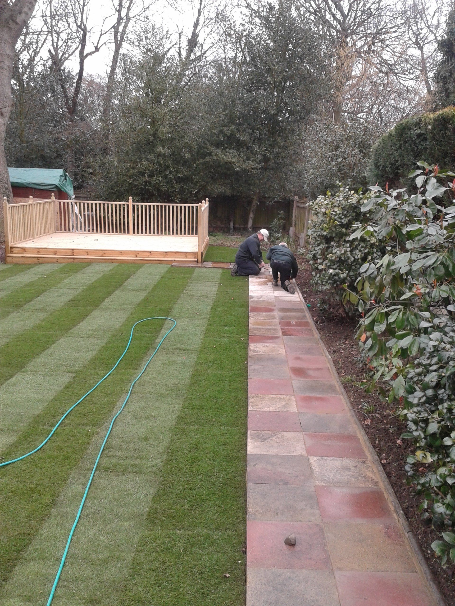 One of our biggest projects to date. We estimate over 20 tons of aggregates, top soil, turf, timber and paving brought in for this job. The end result is a 7m x 8.5m Artificial Grass area. New soft wood Decking, Indian Sandstone Patio and path, with a new lawn surround. What you can't see is a Yew Tree that was dug up/out by hand, an imprinted concrete patch on the existing patio and 18 days of hard work. Well done team, you've done a great job. Thank you.