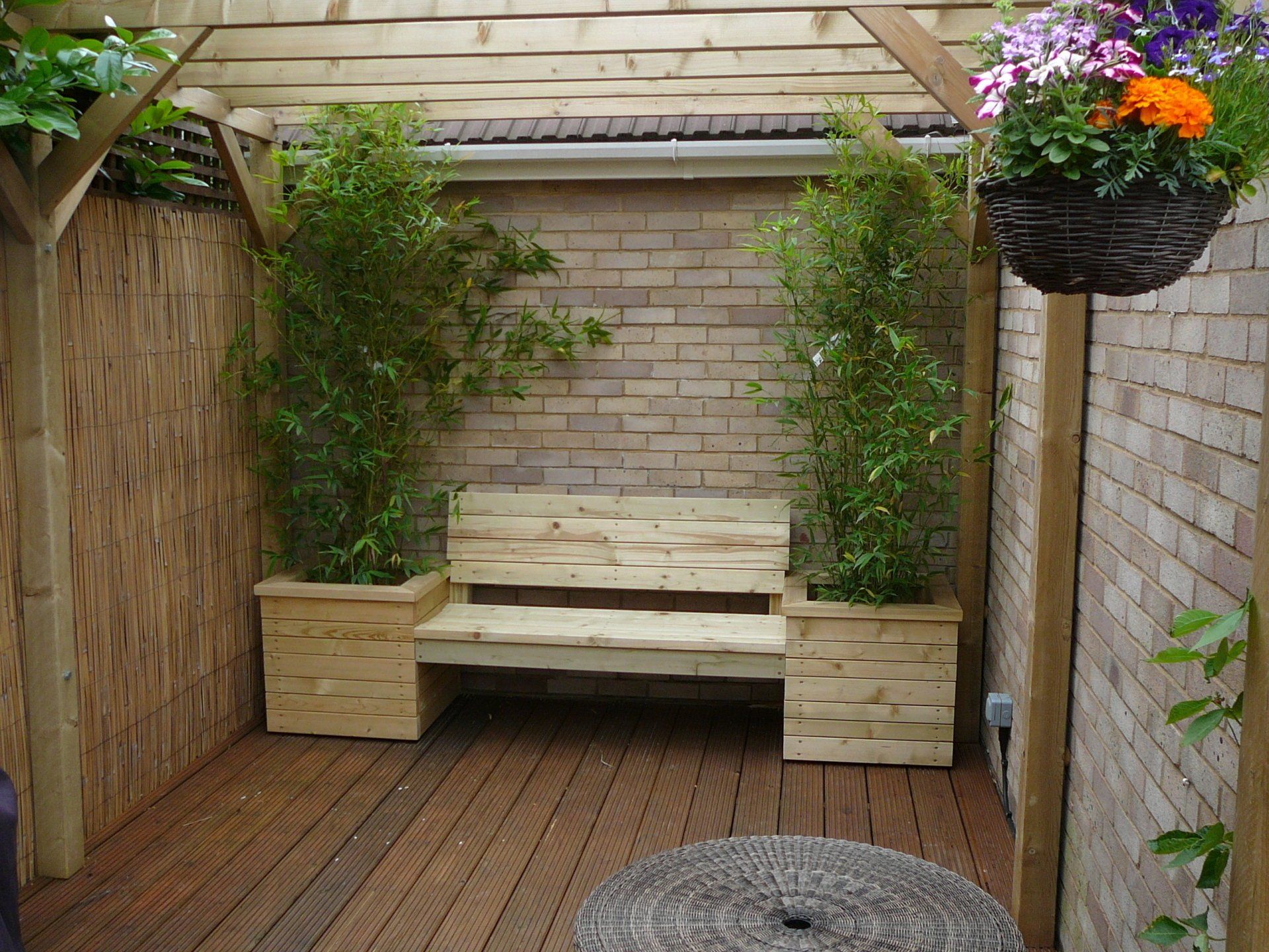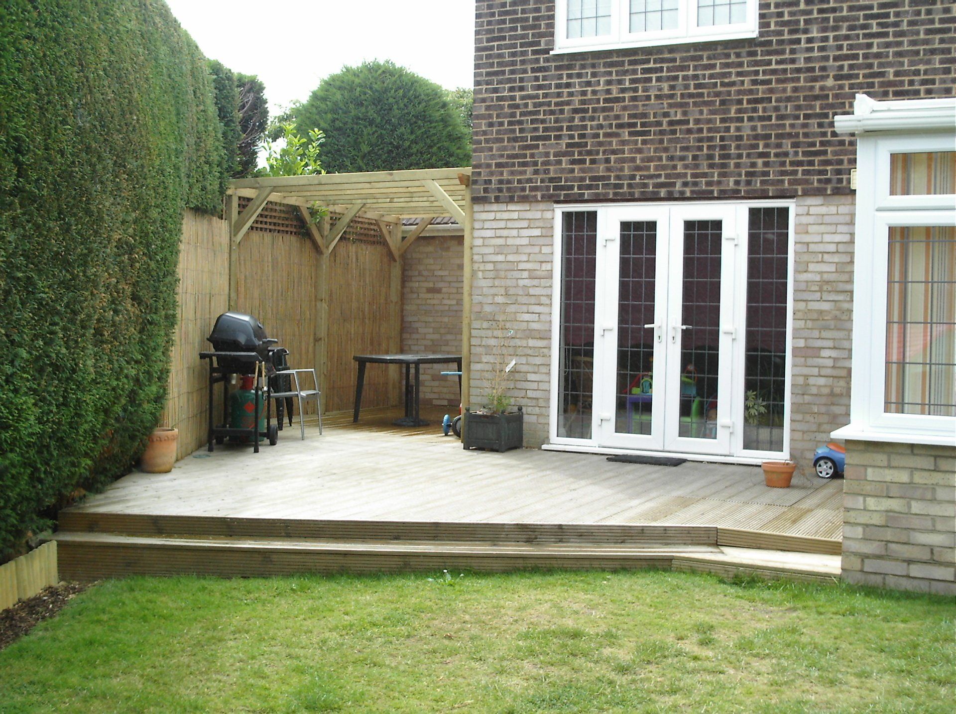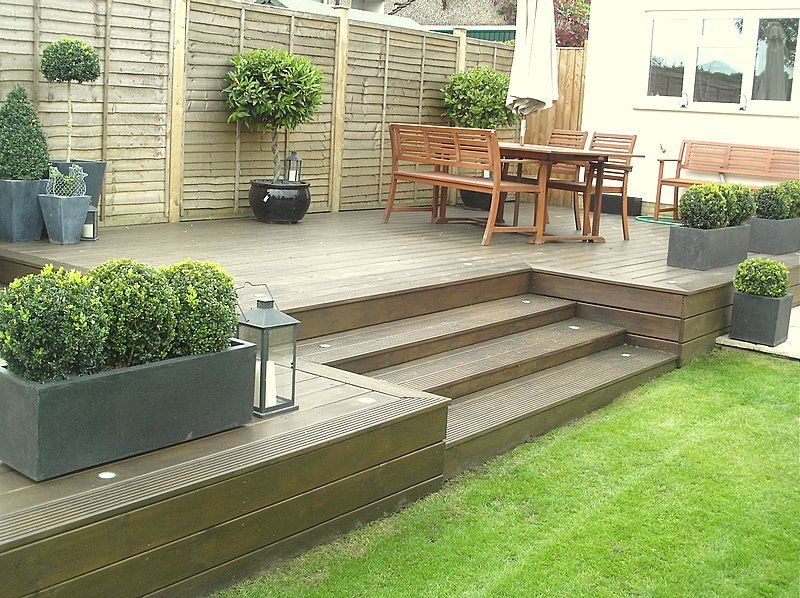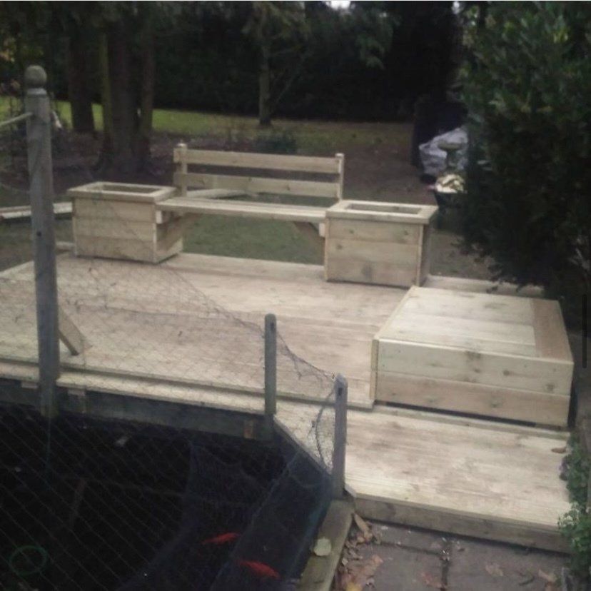 Yet another testing little decking job built on the top terrace of this sloped garden. Tree's and shrubs cut down and removed. Ground cut back, decking laid including a 7m long bench seat, new fence panels hand built at each end and a bespoke set of steps with hand rail. This was otherwise an unusable area of the garden now transformed by RHGS excellent Landscaping Team.